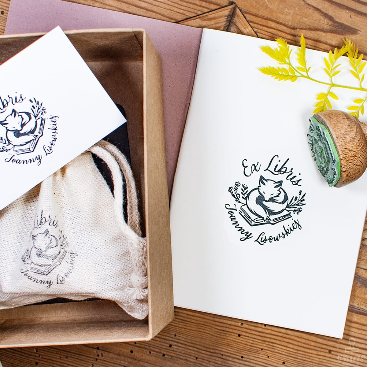 Zestaw prezentowy "Ex Libris" z motywem lisa to idealny wybór dla miłośników literatury i czworonogów. Ten wyjątkowy zestaw zawiera wszystko, co potrzebne, aby nadać książkom z domowej biblioteki osobisty akcent. Drewniana pieczątka z uroczym liskiem na książce, personalizowana tekstem w postaci imienia i nazwiska posiadacza księgozbioru, sprawia, że każda książka staje się niepowtarzalna. Całość jest starannie zapakowana w nasze stylowe pudełko prezentowe retro, co czyni ten zestaw doskonałym prezentem na każdą okazję.