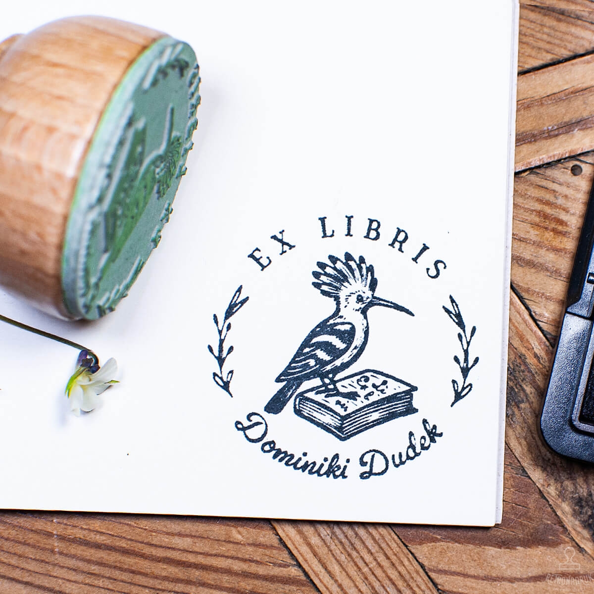Stylowy, personalizowany ekslibris z motywem dudka to wyjątkowy sposób na oznaczenie domowej biblioteki. Pieczątka z imieniem i nazwskiem właściciela i symbolicznym ptakiem dodaje książkom osobistego charakteru. Dudek - ptak kojarzony z mądrością, uważnością i spokojem - to idealny motyw dla każdego miłośnika literatury, który ceni wyjątkowe detale i inspiracje naturą.
