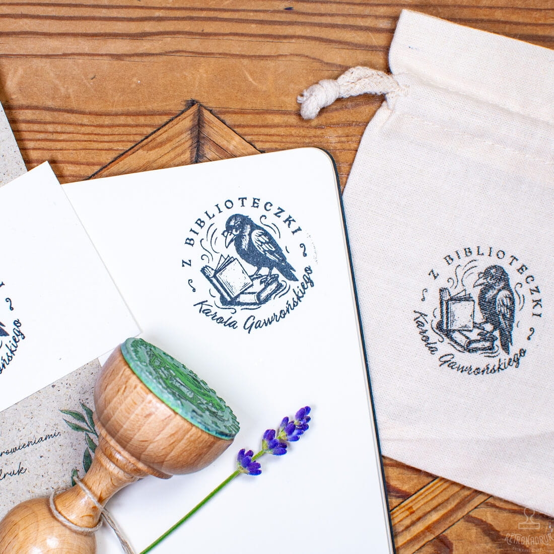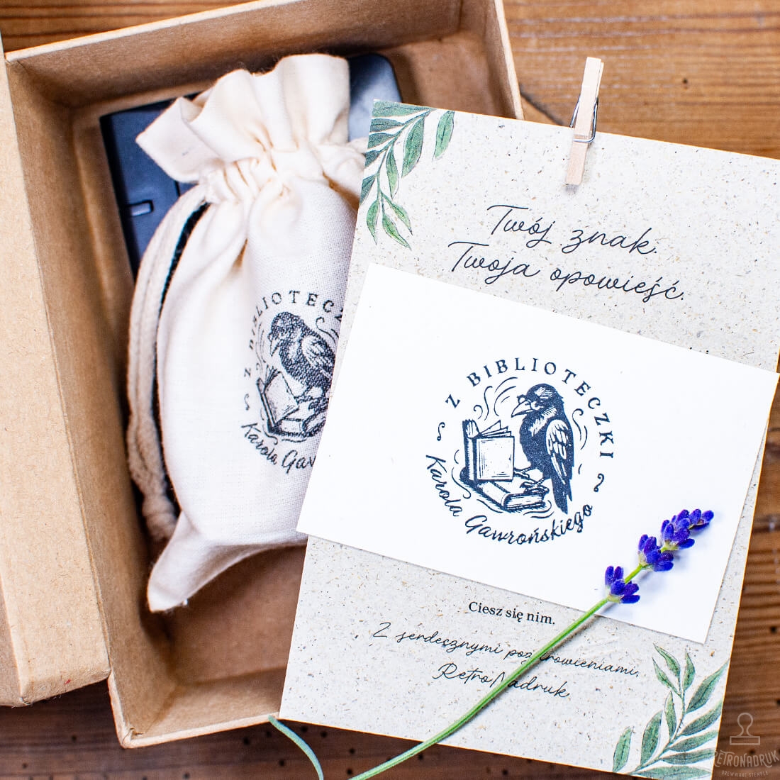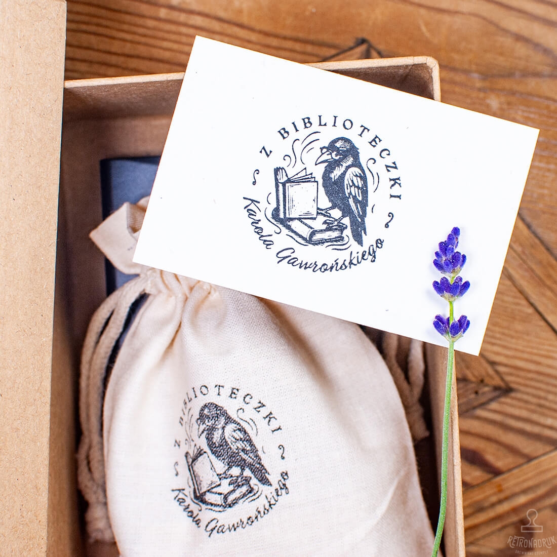 Zestaw prezentowy Ex Libris – drewniana pieczątka z motywem kruka, personalizowana, z tuszownicą i pudełkiem prezentowym. Gotowy, ksiązkowy prezent dla czytelnika.