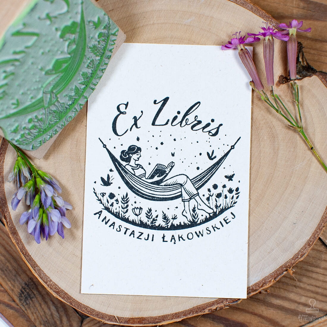 Personalizowana pieczątka Ex Libris z motywem czytelniczki na hamaku w kwietnej łące to elegancki dodatek do każdej biblioteczki. Drewniany stempel z unikalnym wzorem i możliwością personalizacji imieniem oraz nazwiskiem właściciela książek, idealnie nadaje się do oznaczania własnych tomów.