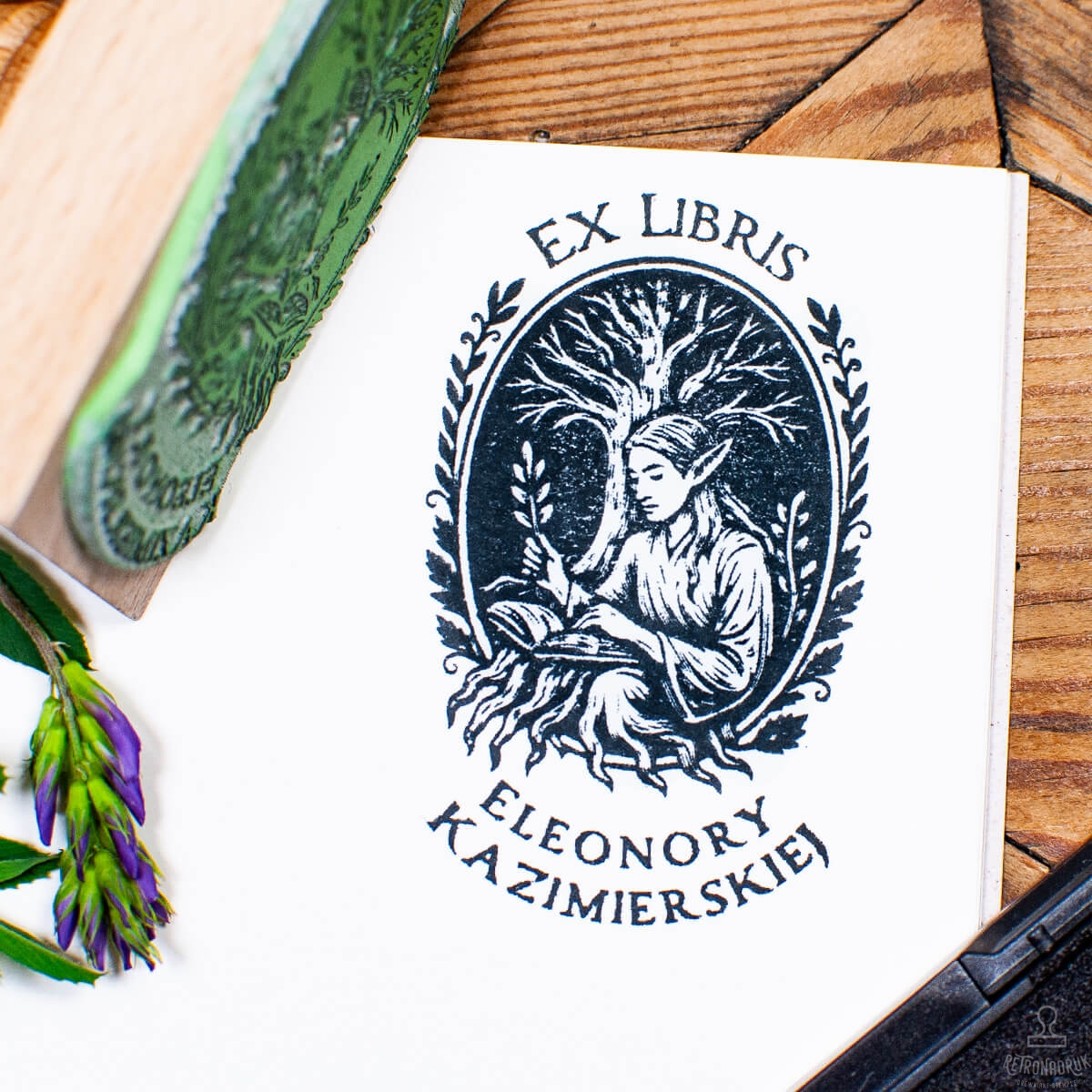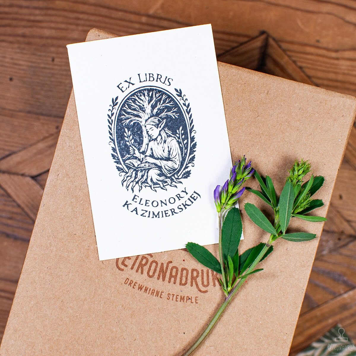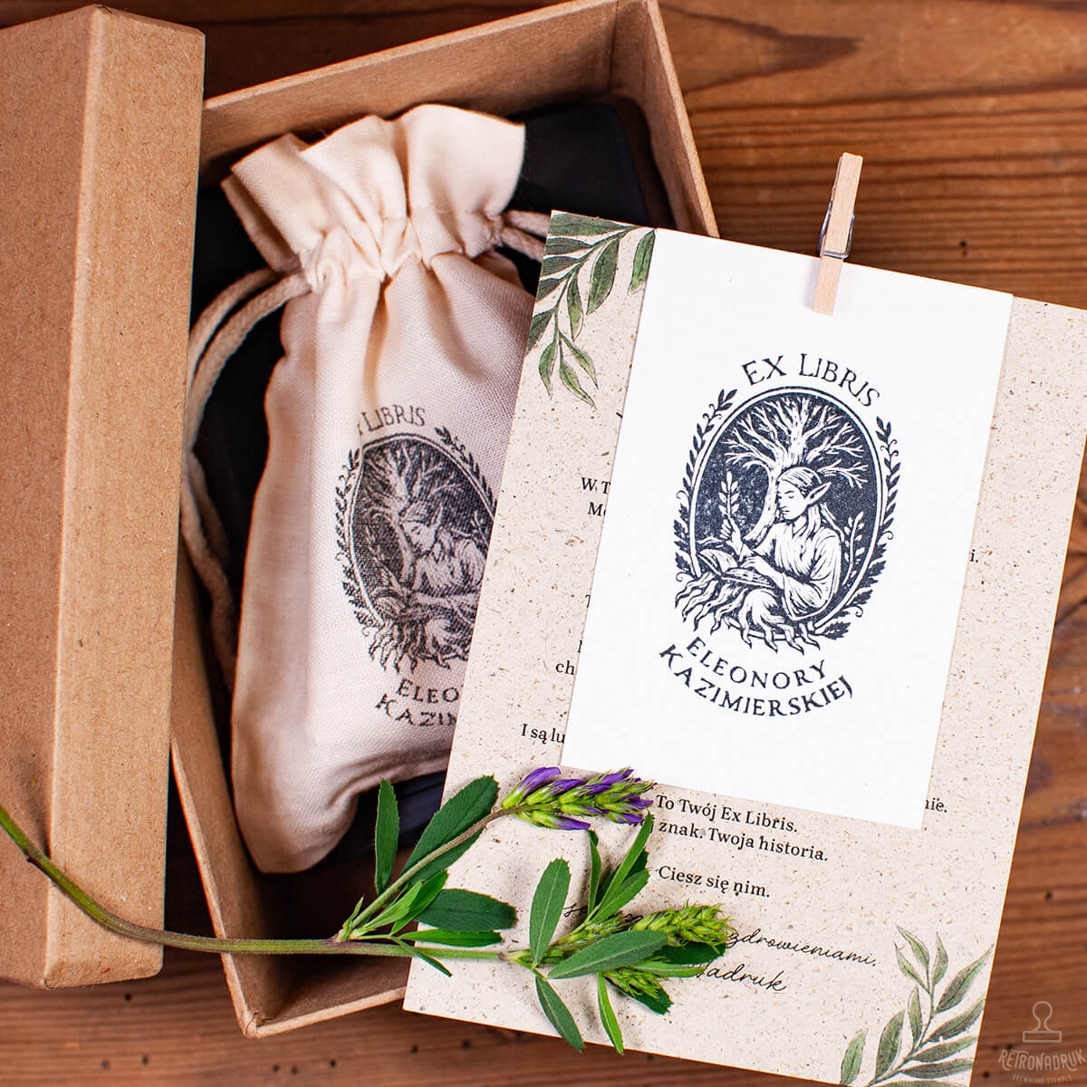 Personalizowany stempel Ex Libris z elfem w zestawie prezentowym.