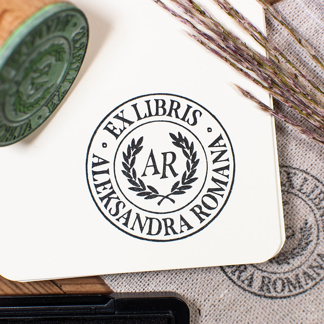 Zestaw Ex Libris z personalizowanym stemplem z inicjałami i motywem liści laurowych. Idealny prezent dla pasjonatów książek.