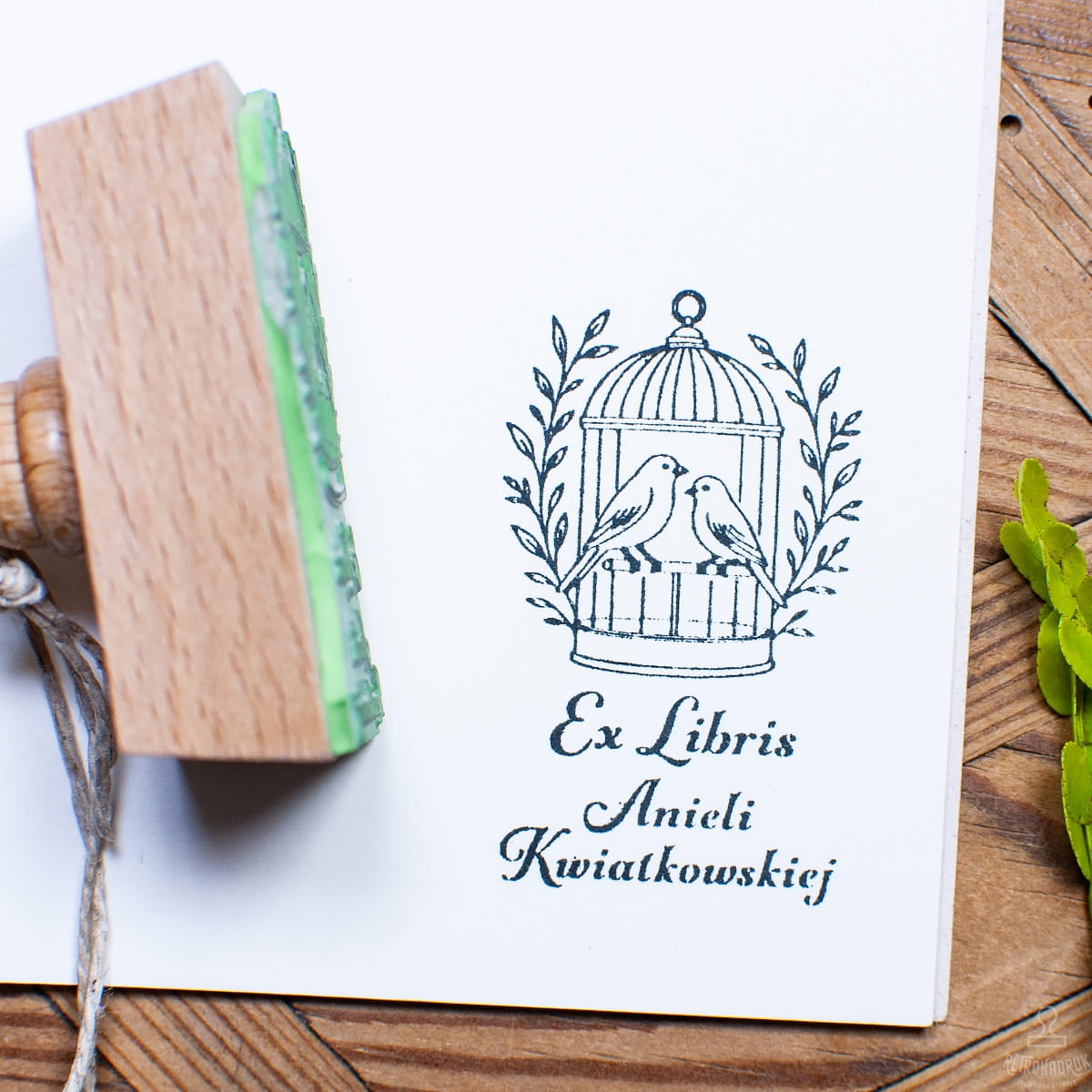 Wprowadź retro klimat do swojej biblioteki dzięki personalizowanej pieczątce Ex Libris z motywem dwóch kanarków w ozdobnej klatce. Ten oldschoolowy stempel, wykonany z naturalnego drewna i wykonywany na indywidualne zamówienie, doda unikalnego charakteru każdej książce z Twojego zbioru.