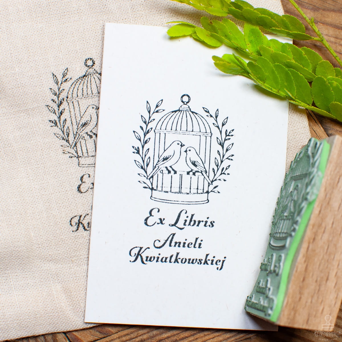 Personalizowana pieczątka Ex Libris z motywem kanarków w klatce – kraftowy stempel do oznaczania książek.