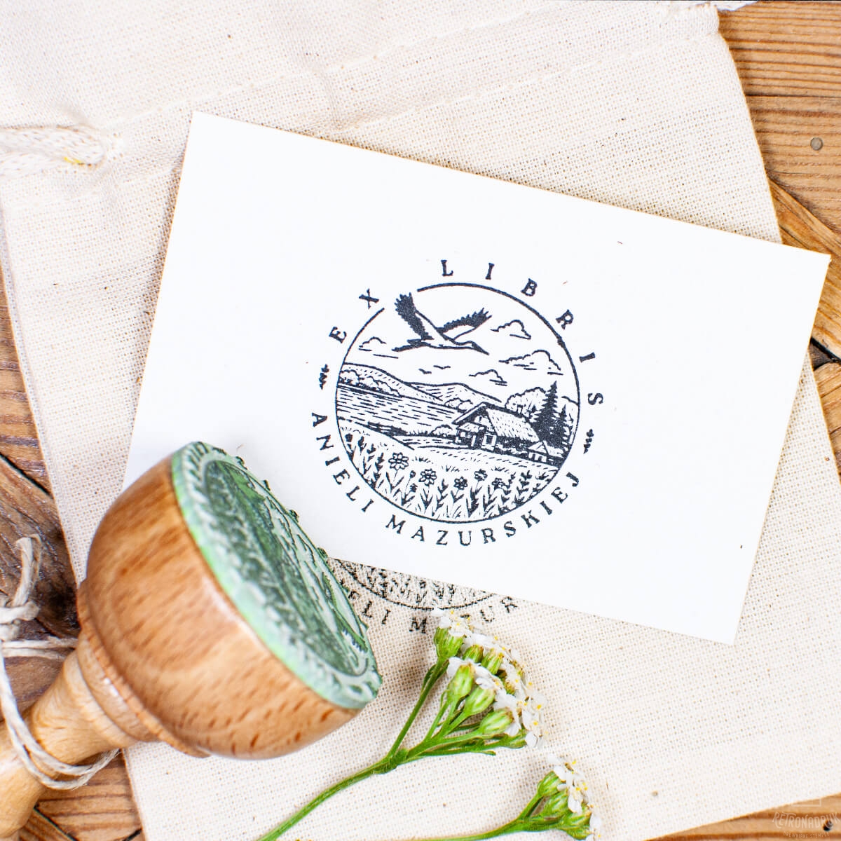 Drewniany stempel ex libris z motywem mazurskiego krajobrazu to wyjątkowy sposób na personalizację domowej biblioteczki. Malownicza chata wśród pól, jezior i kwiatów, a nad nimi majestatycznie szybujący żuraw, oddają atmosferę Mazur – miejsca spokoju, bliskości natury i wytchnienia. Ten ex libris wprowadzi do Twojego księgozbioru nutę nostalgii oraz przywoła wspomnienia beztroskiego wypoczynku.