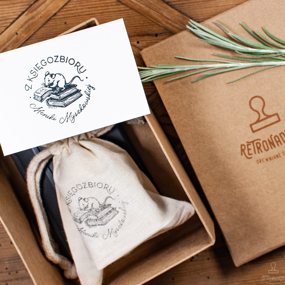 Drewniana pieczątka ex libris z motywem myszy siedzącej na książkach w zestawie prezentowym dla miłośników literatury i sympatyków zwierząt.