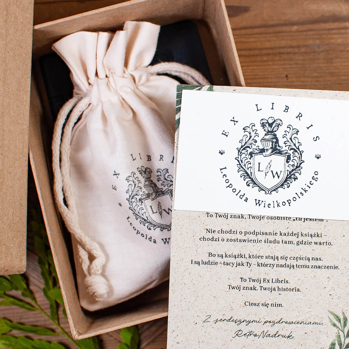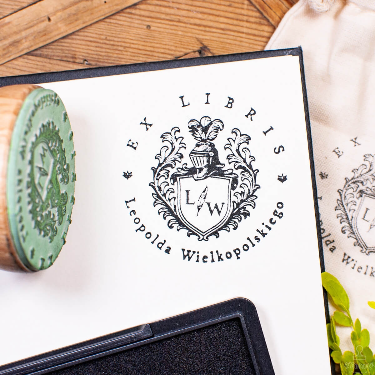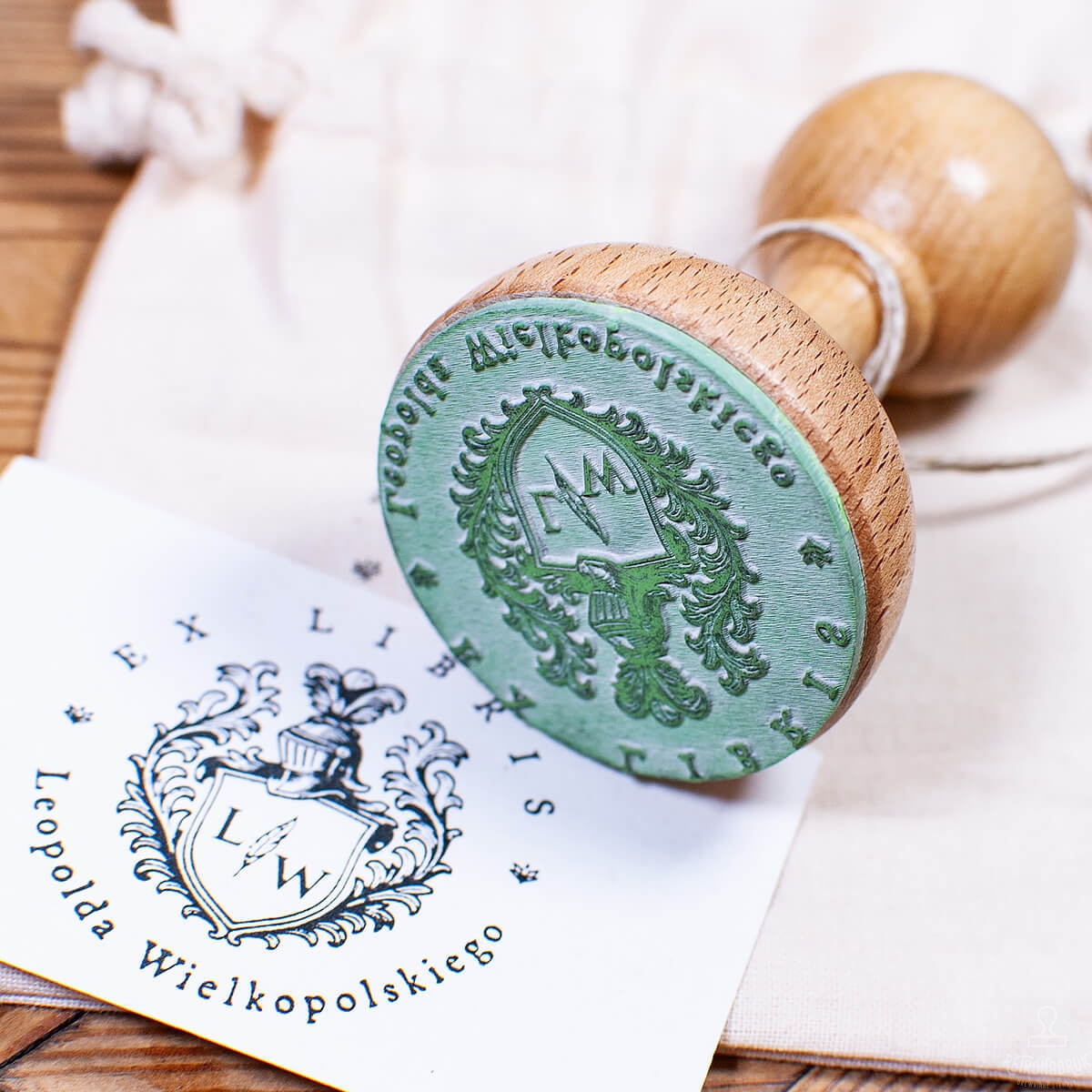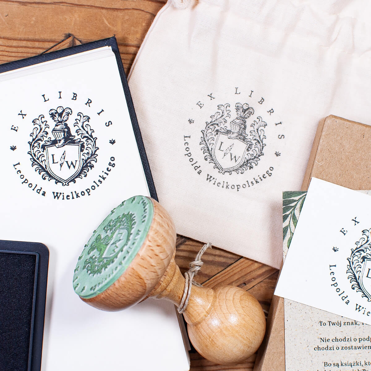 Personalizowany zestaw Ex Libris z motywem herbu – pieczątka 50 mm, tusz i woreczek w stylowym pudełku. Idealny prezent dla miłośnika książek.