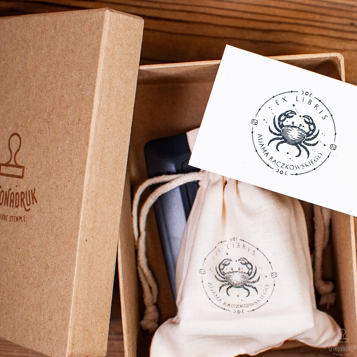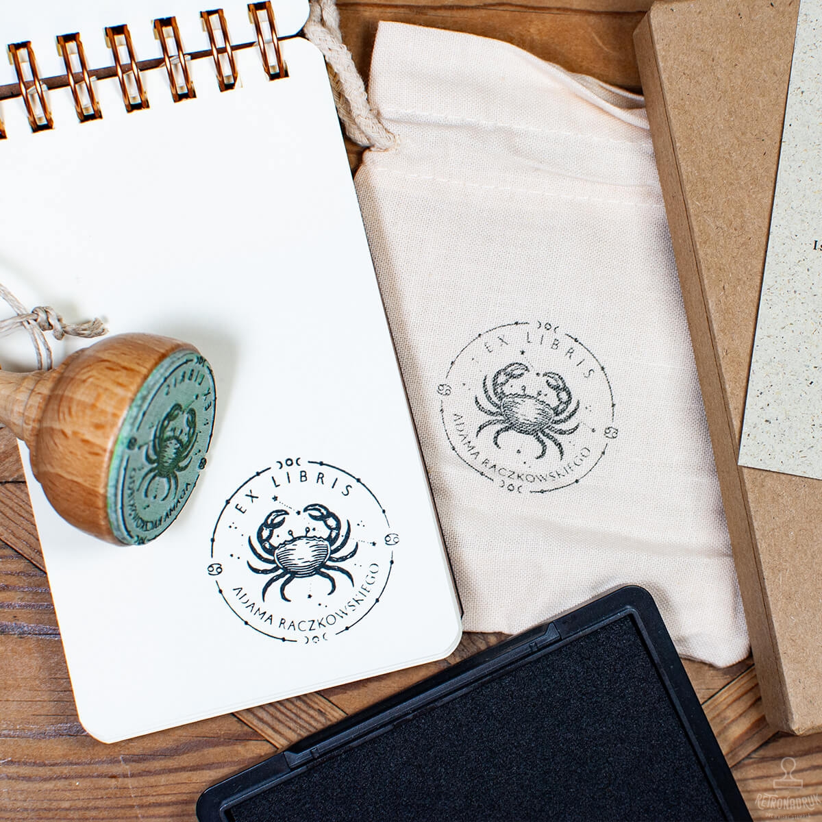 Personalizowany stempel ex libris z motywem zodiakalnego Raka. Zestaw prezentowy z tuszem, woreczkiem i pudełkiem retro.