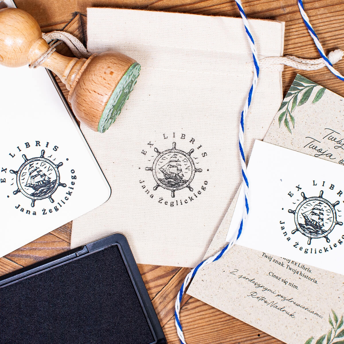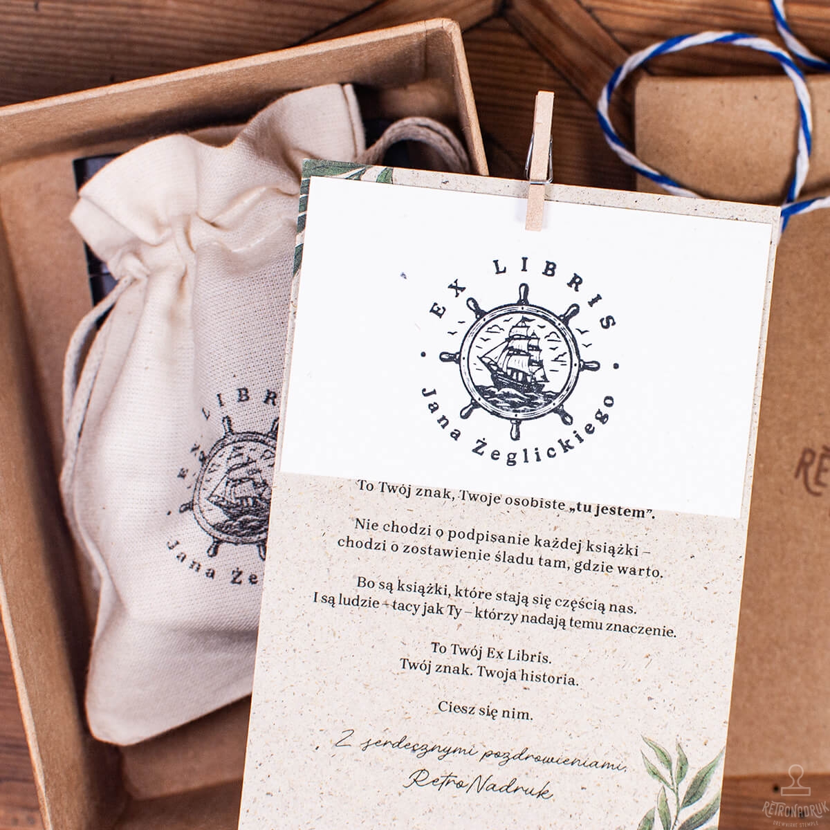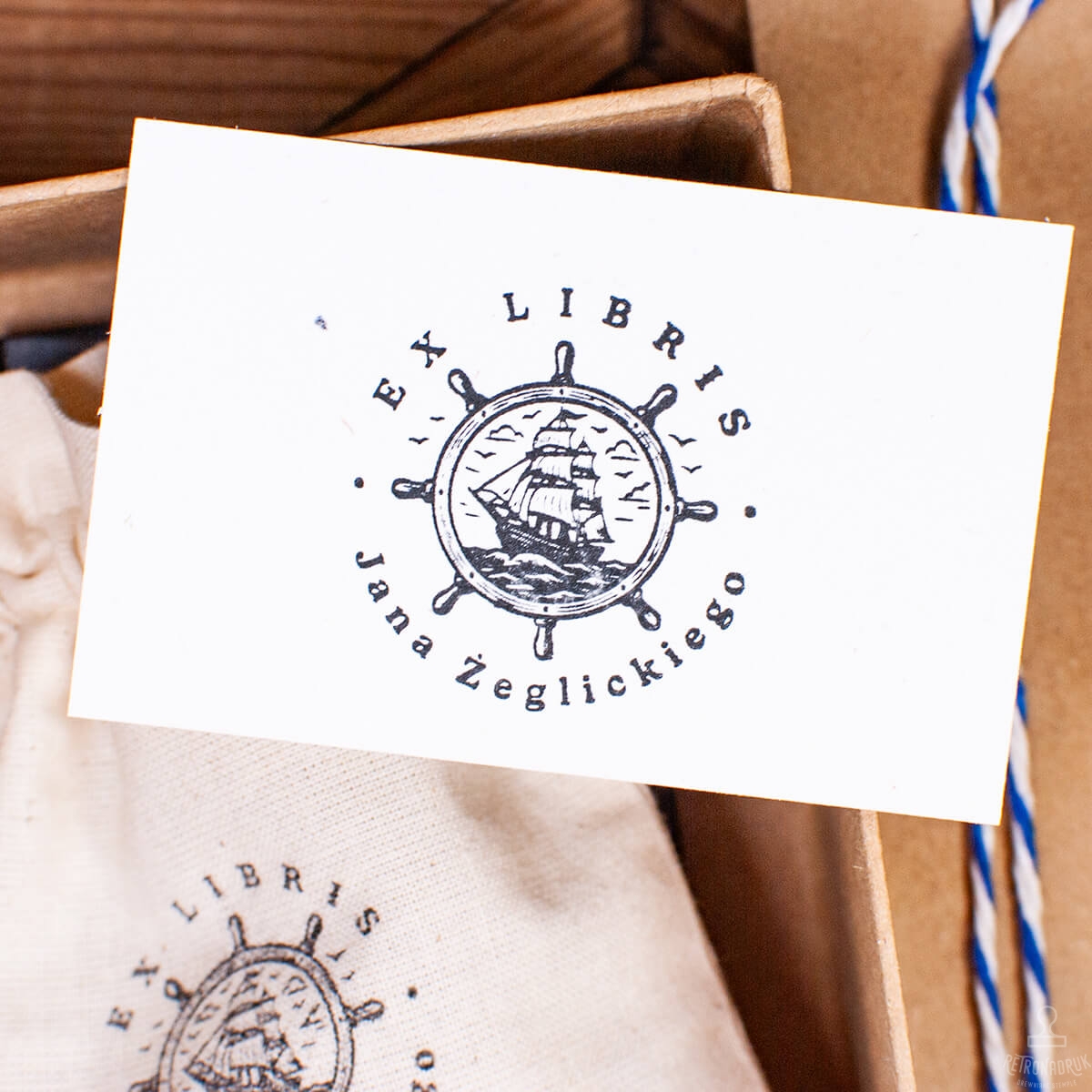 Personalizowany zestaw Ex Libris z motywem żaglowca – drewniany stempel w pudełku retro z poduszką i woreczkiem. Idealny prezent dla miłośników książek, żeglarstwa i marynistycznych klimatów.