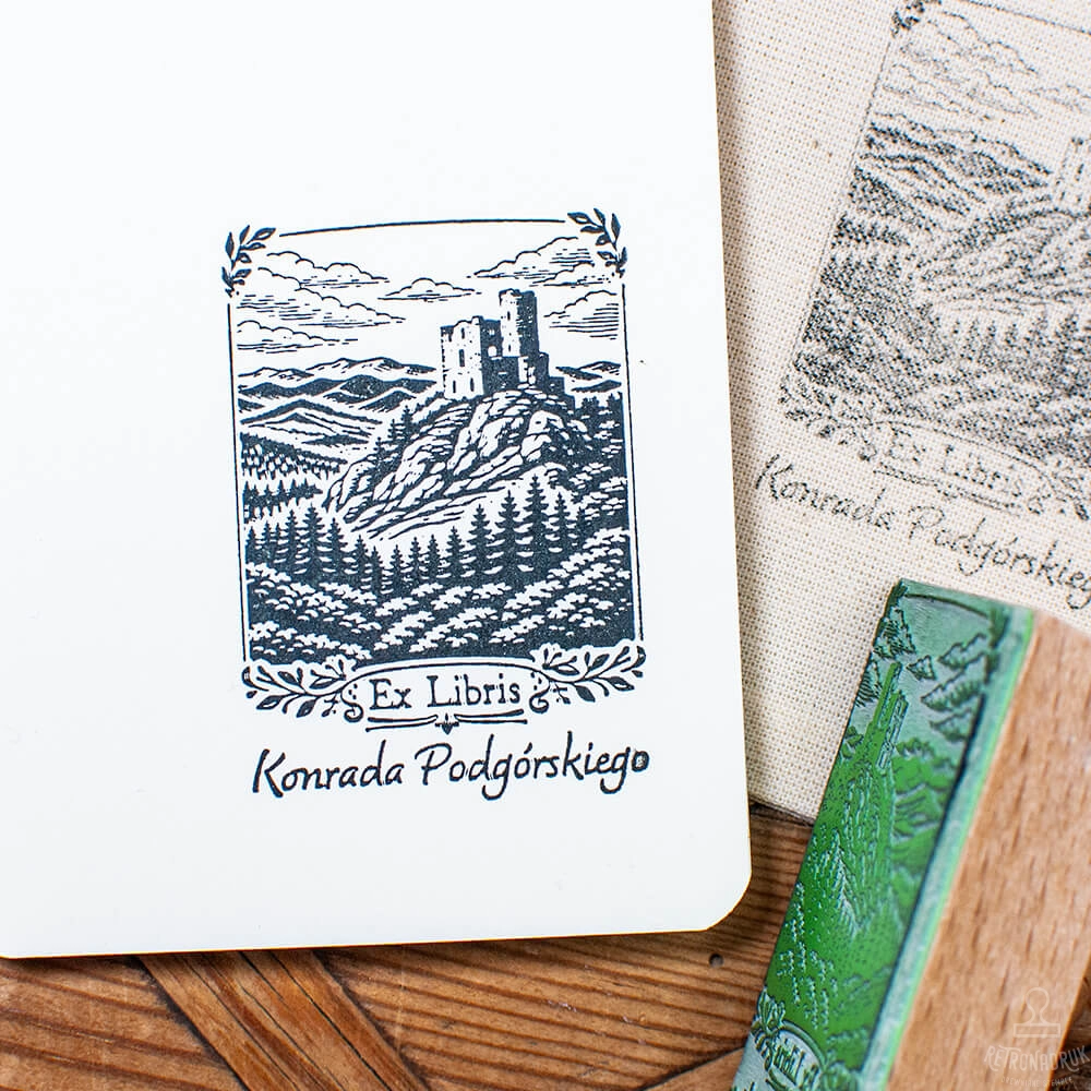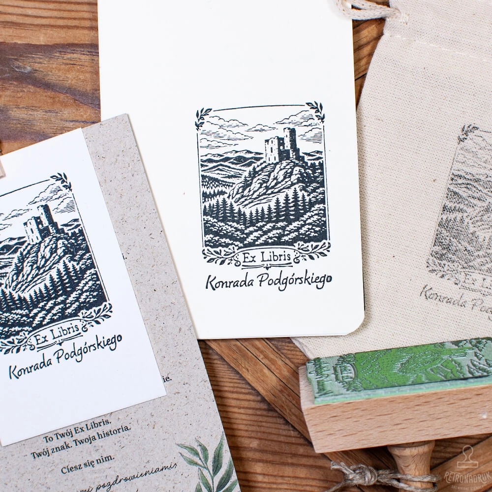 - personalizowany stempel ex libris z motywem zamku w górach (rozmiar 40x60 mm),