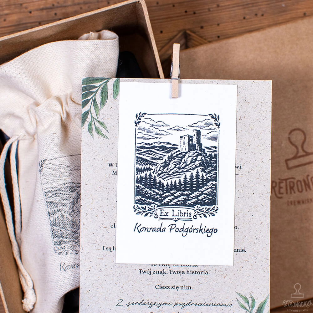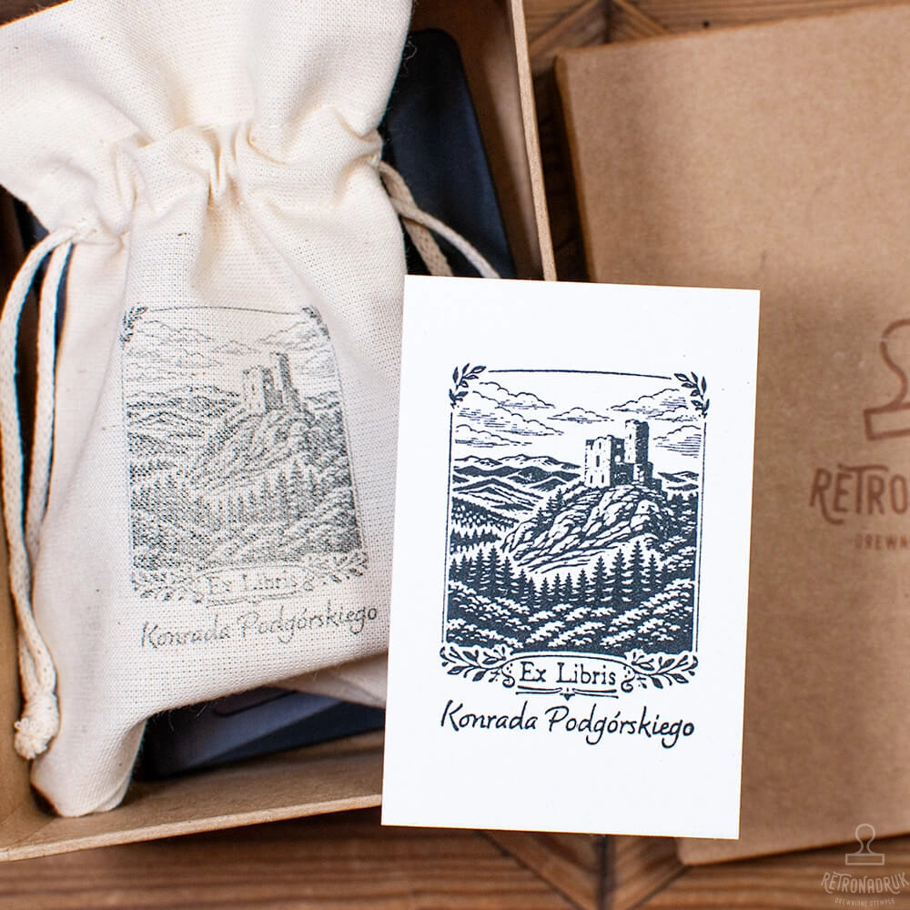 Zestaw ex libris z motywem zamku w górach - personalizowany stempel do książek z poduszką, woreczkiem i pudełkiem retro. Idealny na prezent.