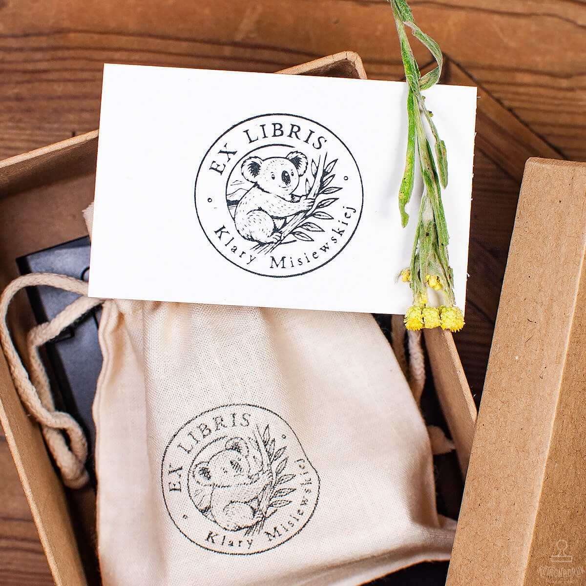 Personalizowany stempel Ex Libris z motywem koali – idealny dla miłośnika książek. Drewniana pieczątka z imieniem, dostępna również w zestawie prezentowym retro.