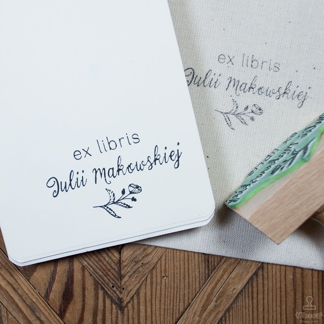 Każdy stempel Ex Libris jest indywidualnie personalizowany tekstem, co czyni go wyjątkowym i jedynym w swoim rodzaju. Na fotografii prezentujemy przykładowe imię i nazwisko.