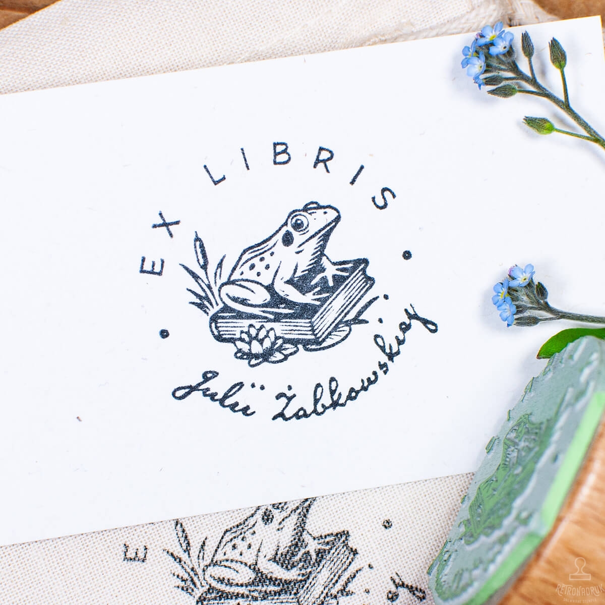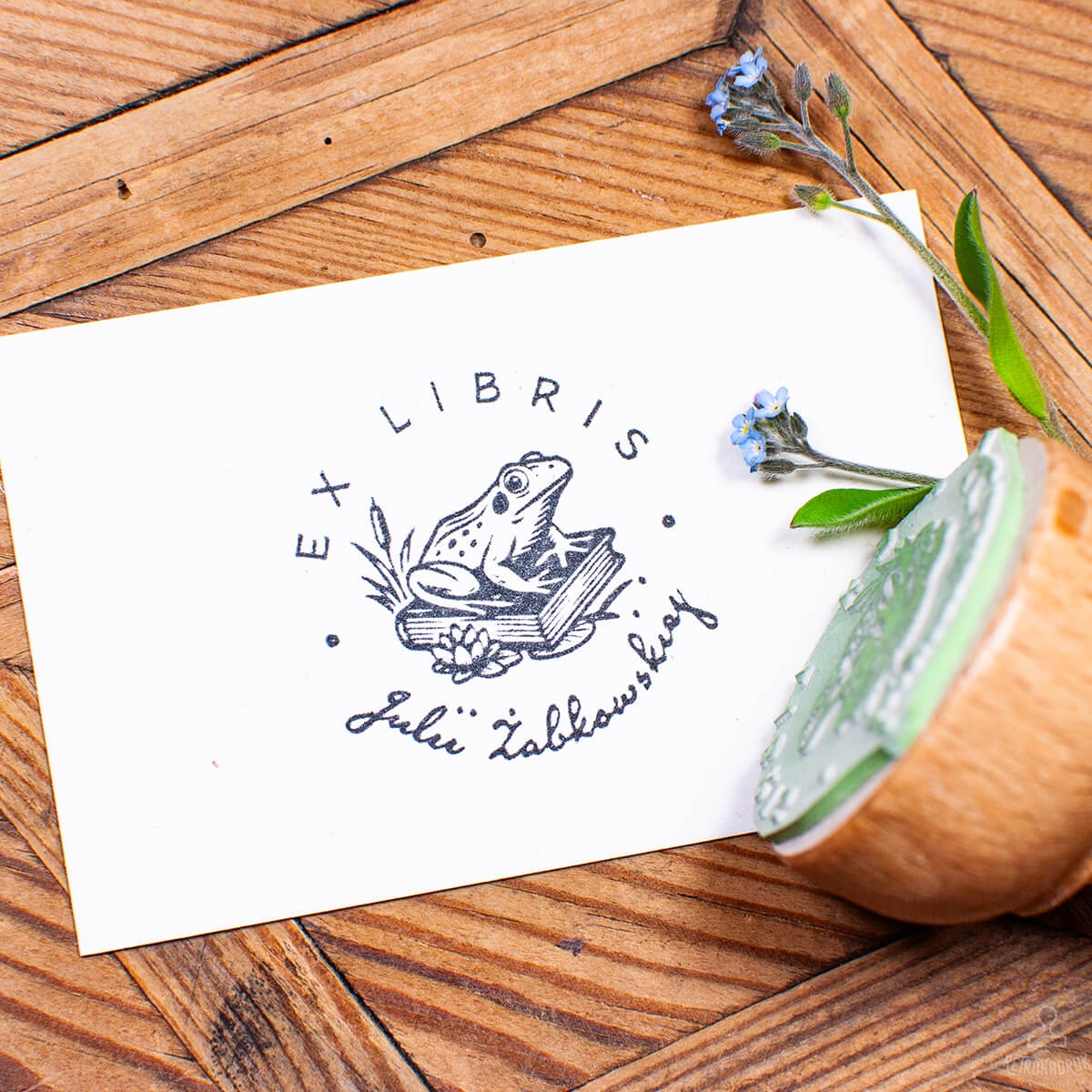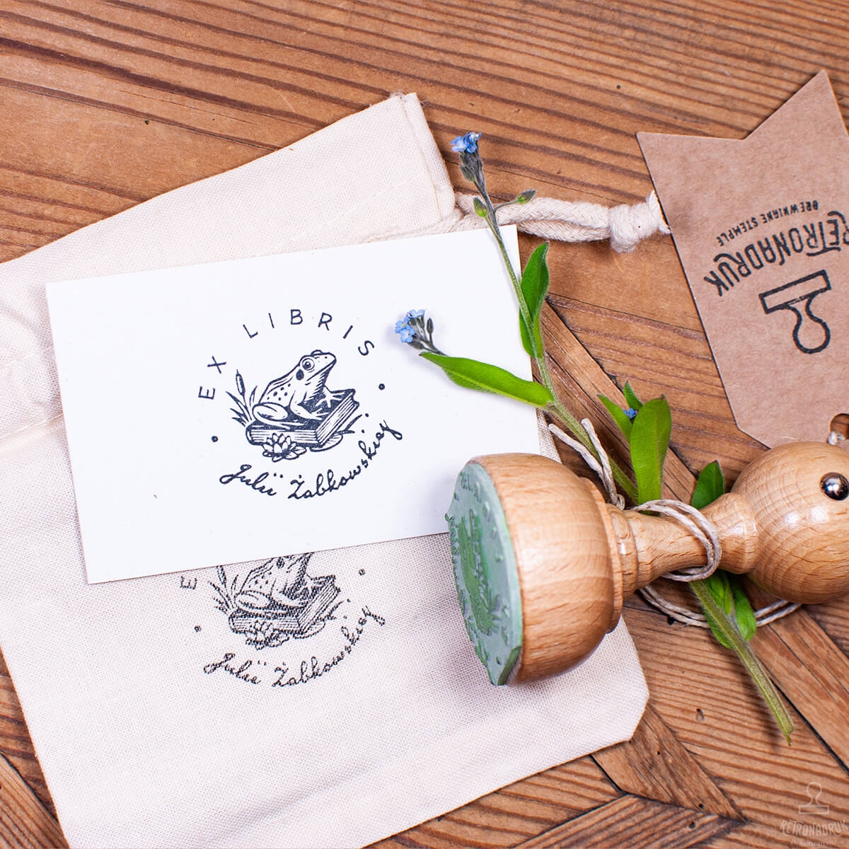 Drewniana pieczątka Ex Libris z motywem żaby - personalizowany stempel do książek.