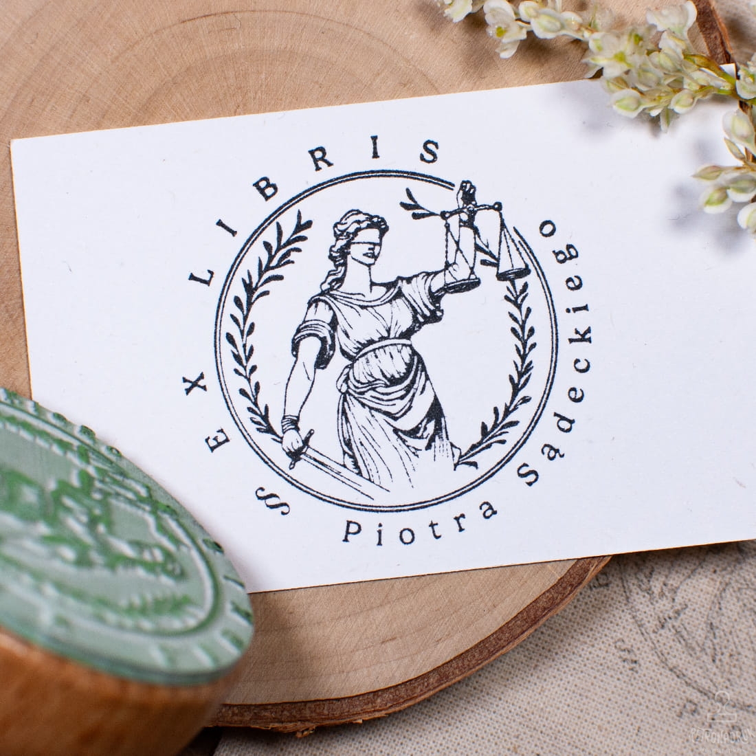 Personalizowana pieczątka Ex Libris z motywem Temidy, doskonała do oznaczania książek w domowej biblioteczce. Drewniany stempel w stylu retro, idealny na prezent dla miłośników literatury i symboliki prawniczej.
