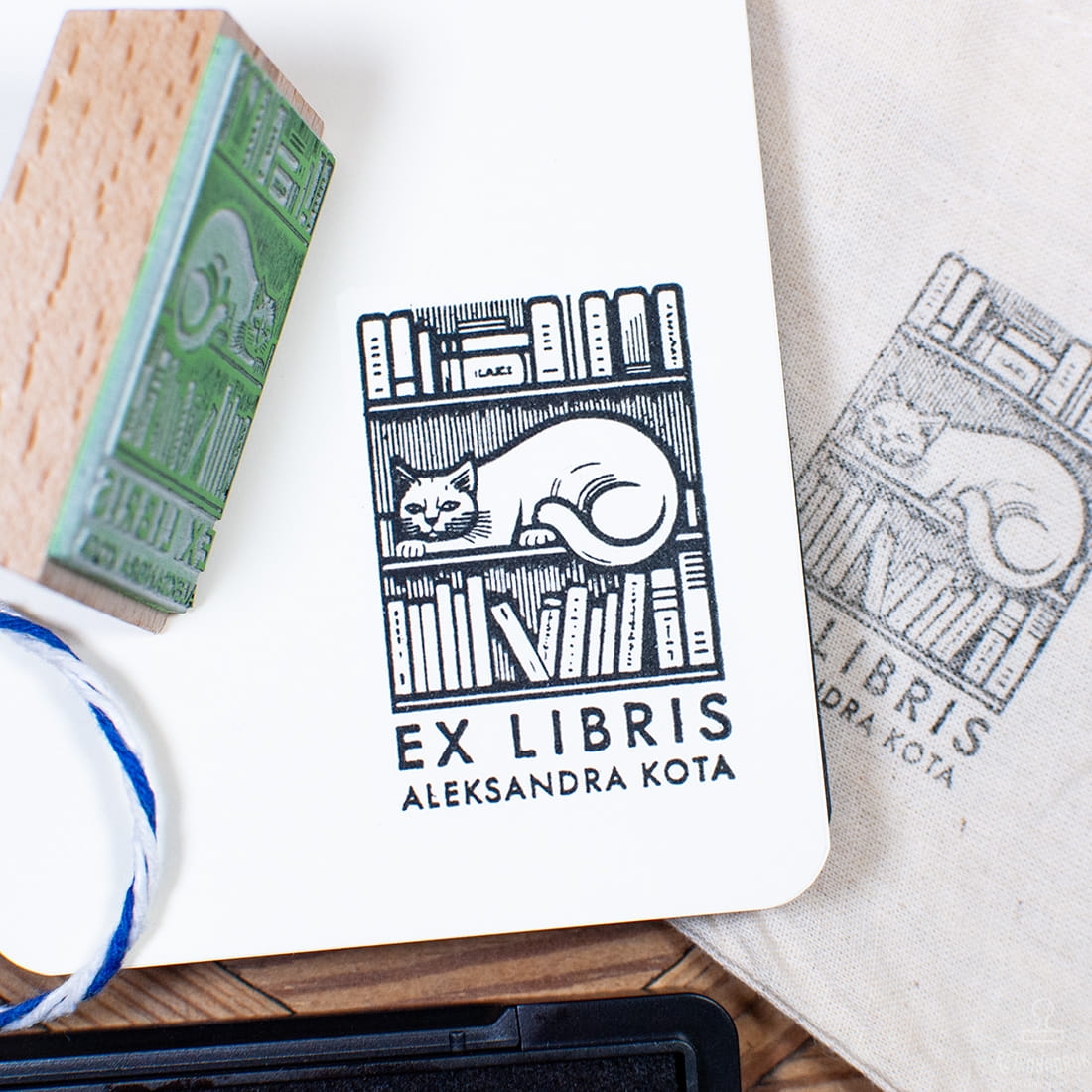 Personalizowana drewniana pieczątka Ex Libris z motywem kocura leżącego na regałach z książkami, idealna do oznaczania książek i jako prezent dla miłośników książek i kotów.
