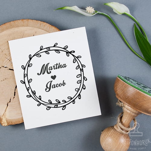 Drewniana pieczątka ślubna z wiankiem do zindywidualizowania imionami Pary Młodej i datą ślubu.