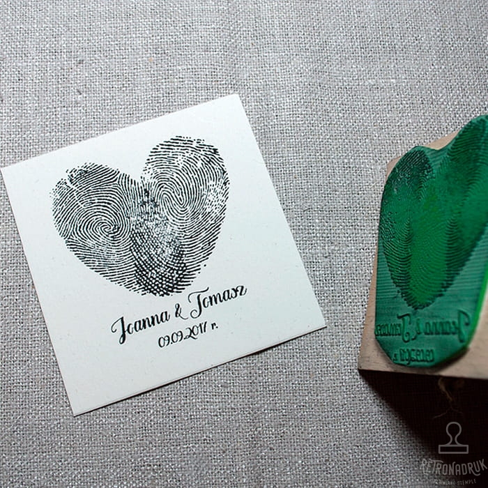 Duża pieczątka ślubna z motywem docisków palców w kształcie serca.