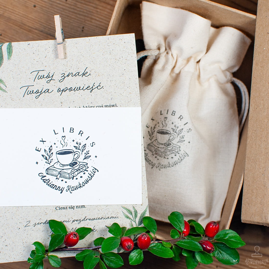 Zestaw prezentowy Ex Libris z filiżanką kawy i kostką czekolady to wyjątkowy pomysł na personalizowany prezent dla osoby, która ceni chwile spokoju z książką i aromatycznym napojem. Motyw kawy połączonej ze słodką kostką czekolady tworzy oldschoolowy klimat, pełen domowego ciepła, relaksu i przyjemności. To doskonały upominek dla miłośniczki lub miłośnika literatury i kawowych rytuałów.