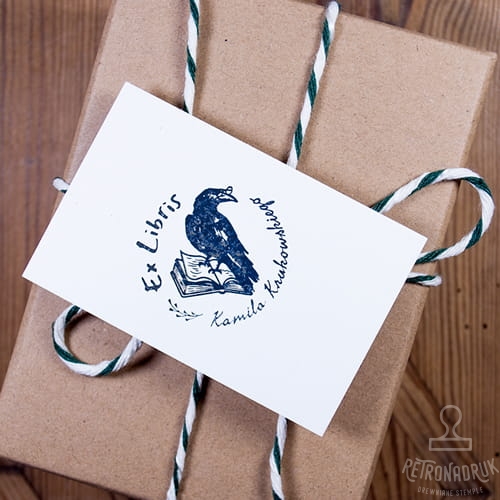 Ex Libris z motywem kruka w okularach siedzącego na książce w zestawie na prezent dla mola książkowego. Zestaw ex libris to wyjątkowy pomysł na personalizowany prezent dla miłośników czytania i posiadaczy domowych biblioteczek.