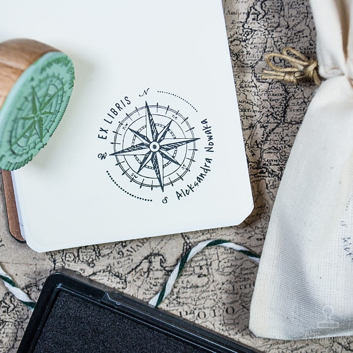 Stempel, pieczątka Ex Libris z motywem róży wiatrów w zestawie prezentowym dla miłośnika książek i podróżowania.