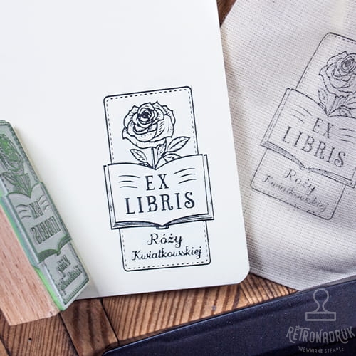 Ex libris z motywem róży i książki do personalizacji tekstem w zestawie na prezent dla mola książkowego. Wyjątkowy drewniany stempel imienny do personalizowania książek. Ex Libris idealny na prezent dla miłośników literatury i posiadaczy domowych biblioteczek.