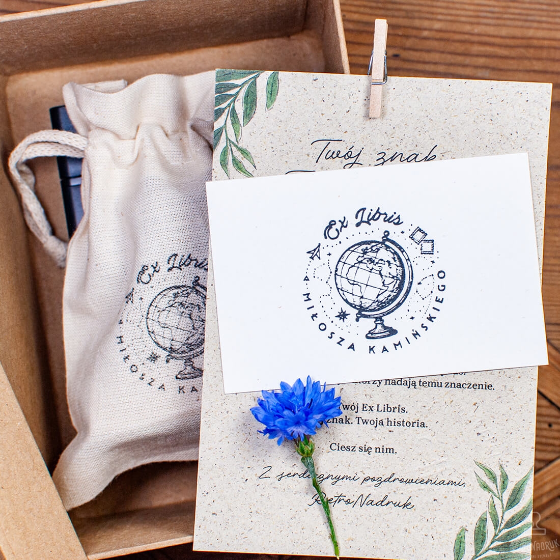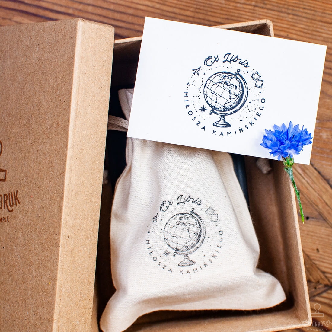- Drewnianą pieczątkę Ex Libris z motywem globusa – średnica 40 lub 50 mm do wyboru.