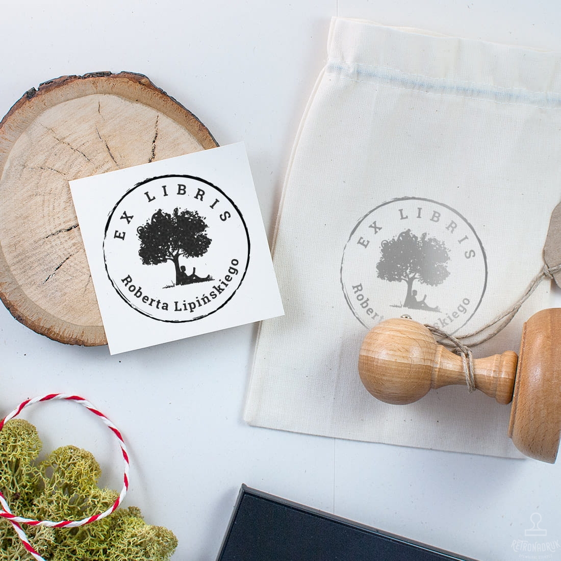 Pieczątka Ex Libris z motywem postaci czytającej pod drzewem w zestawie na wyjątkowy prezent dla mola książkowego. Idealny na prezent dla miłośników książek lub do opieczętowania własnych książek z domowej biblioteczki.