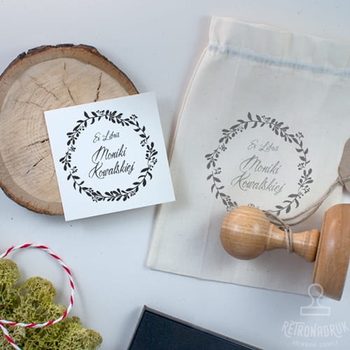 Zestaw prezentowy Ex Libris do oznaczania książek - duży stempel z motywem wianka.