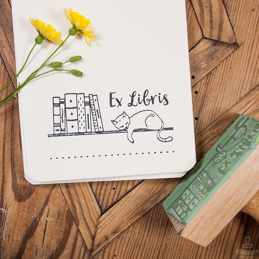 Ex Libris pieczątka z grafiką półki z książkami i kotem