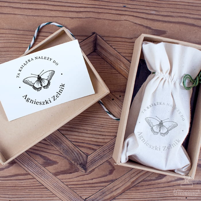 Stempel ex libris z motywem owada w zestawie na prezent dla miłośnika przyrody i książek.