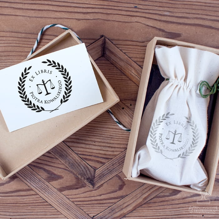 Pieczątka exlibris z motywem wagi w zestawie na prezent dla miłośnika książek.