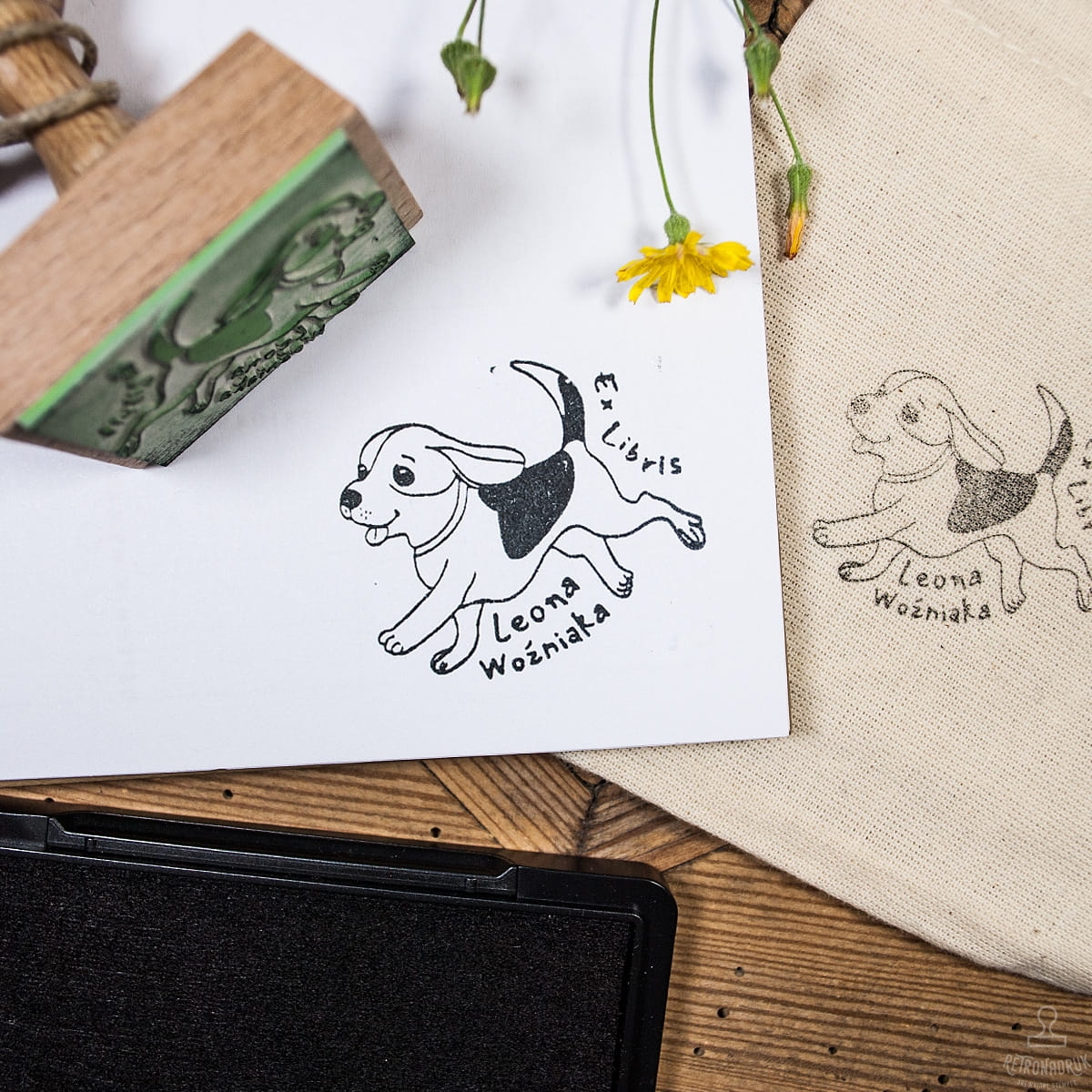 - Praktyczny woreczek bawełniany, w którym można przechowywać stempel. Ten dodatek sprawi, że użytkownik będzie mógł zawsze mieć swoją pieczątkę z motywem Beagle pod ręką, gotową do wykorzystania.