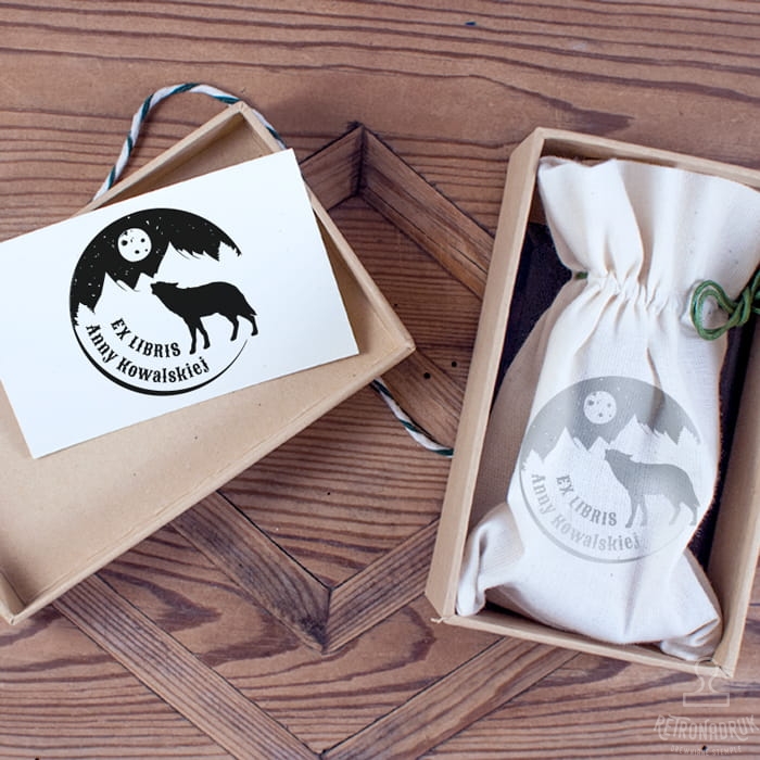 Stempel exlibris z motywem wilka w zestawie na prezent dla miłośnika książek i natury.