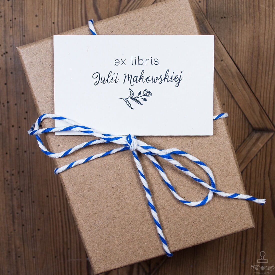 Exlibris - pieczątka personalizowana z motywem maku do przybijania na pierwszych stronach książkach. Pieczątka z tuszownicą w kraftowym pudełku prezentowym. Drewniane pieczątki ex libris są świetnym pomysłem na elegancki prezent dla każdego miłośnika czytania.