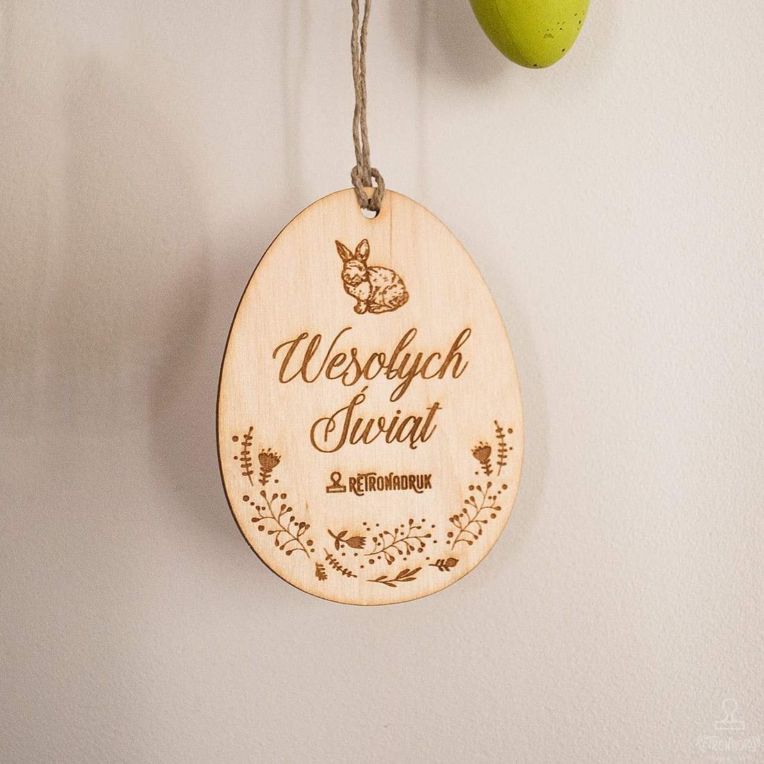 Jajko wielkanocne ze sklejki z motywem zajączka wielkanocnego. Zawieszki firmowe w kształcie jaja z życzeniami na Wielkanoc.