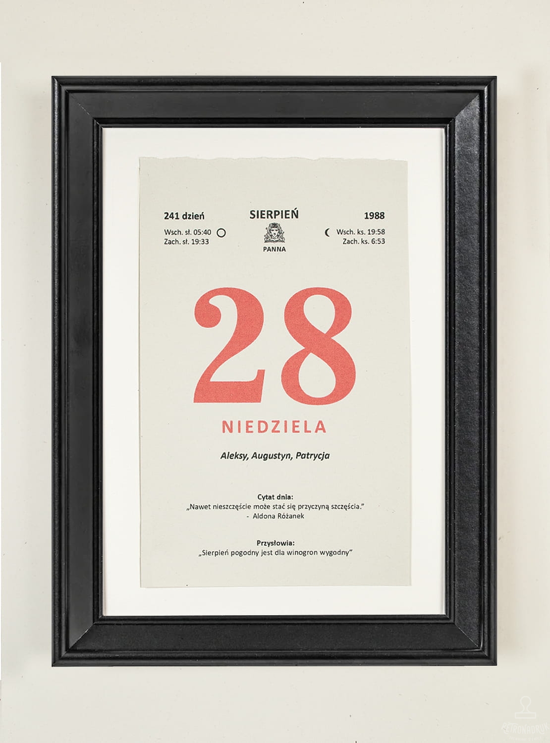 Personalizowana kartka z kalendarza z wybraną datą z przeszłości - oprawiona w czarną ramkę do postawienia lub powieszenia. To wyjątkowy i symboliczny upominek, idealny na jubileusz, rocznicę, ważną okazję lub jako pamiątka konkretnego dnia. Styl retro i minimalistyczna forma sprawiają, że prezentuje się elegancko zarówno w domu, jak i w biurze.