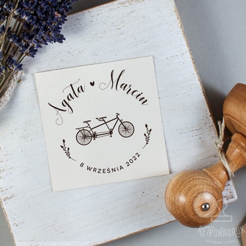 Okrągła pieczątka ślubna rower