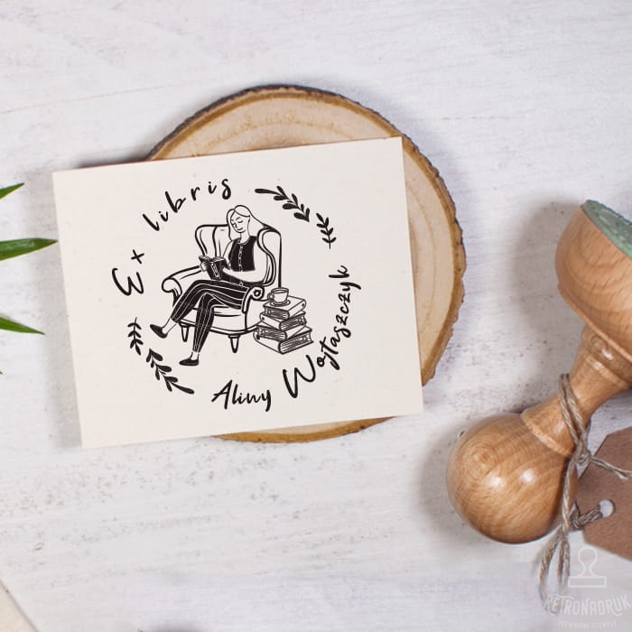 Okrągły stempel ex libris z motywem czytelniczki to piękna pieczątka do oznaczania książek w domowej biblioteczce. Motyw przedstawiający czytelniczkę siedzącą na fotelu z książką w ręku dodaje każdej książce ciepłego i osobistego charakteru. Stempel jest personalizowany imieniem i nazwiskiem, co czyni go idealnym dodatkiem do Twojego księgozbioru oraz doskonałym pomysłem na prezent dla każdego miłośnika literatury.