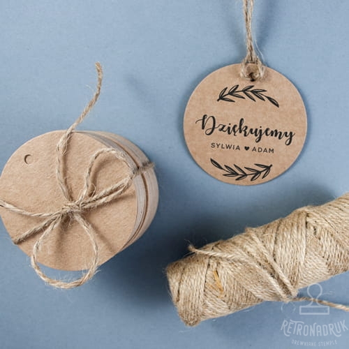 Okrągłe zawieszki ślubne plus stempel z napisem "Dziękujemy" i imionami Narzeczonych do personalizacji. Zestaw ślubny do samodzielnego tworzenia wyjątkowych spersonalizowanych etykiet weselnych np. na prezenciki dla Gości.