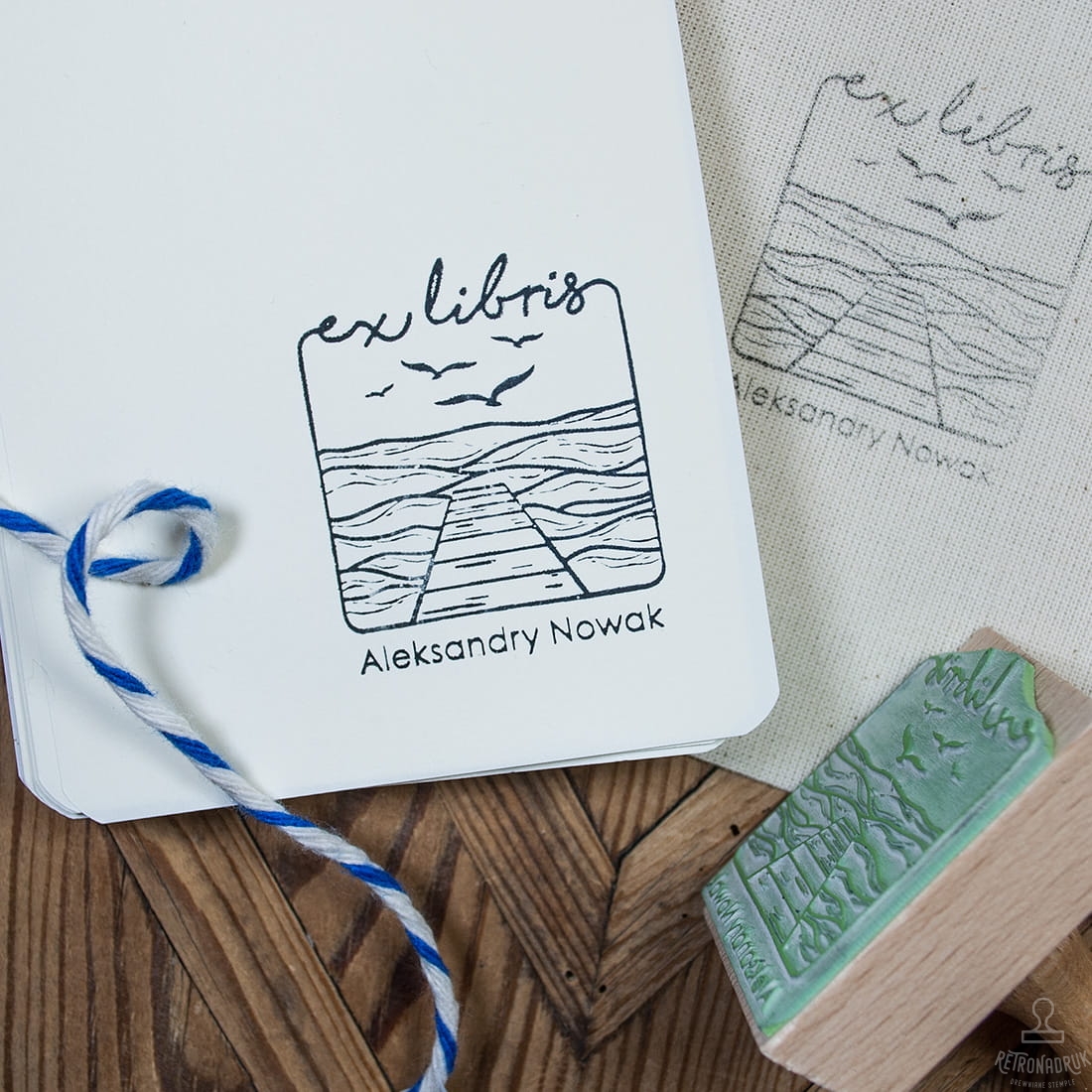 Pieczątka ekslibris z motywem morza, personalizowana imieniem i nazwiskiem, idealna do oznaczania książek z domowej biblioteczki. Drewniany stempel z widokiem na morze to doskonały prezent dla miłośników literatury i morskich krajobrazów.