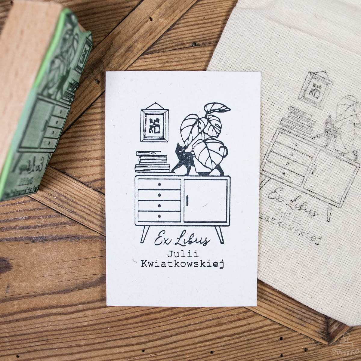 Drewniana pieczątka Ex Libris z motywem komody z książkami i kotem, personalizowana imieniem i nazwiskiem właściciela książek.