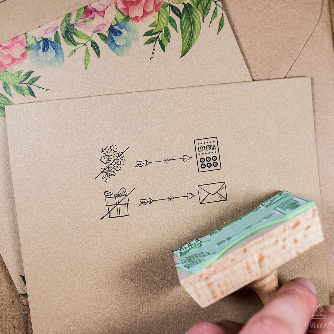 Pieczątka z informacjami graficznymi będącymi delikatną sugestią jakie rodzaje prezentów ślubnych, jakie Nowożeńcy chcieliby otrzymać. Stempel do tworzenia papierowych karteczek z rebusami dołączanych do zaproszeń ślubnych.