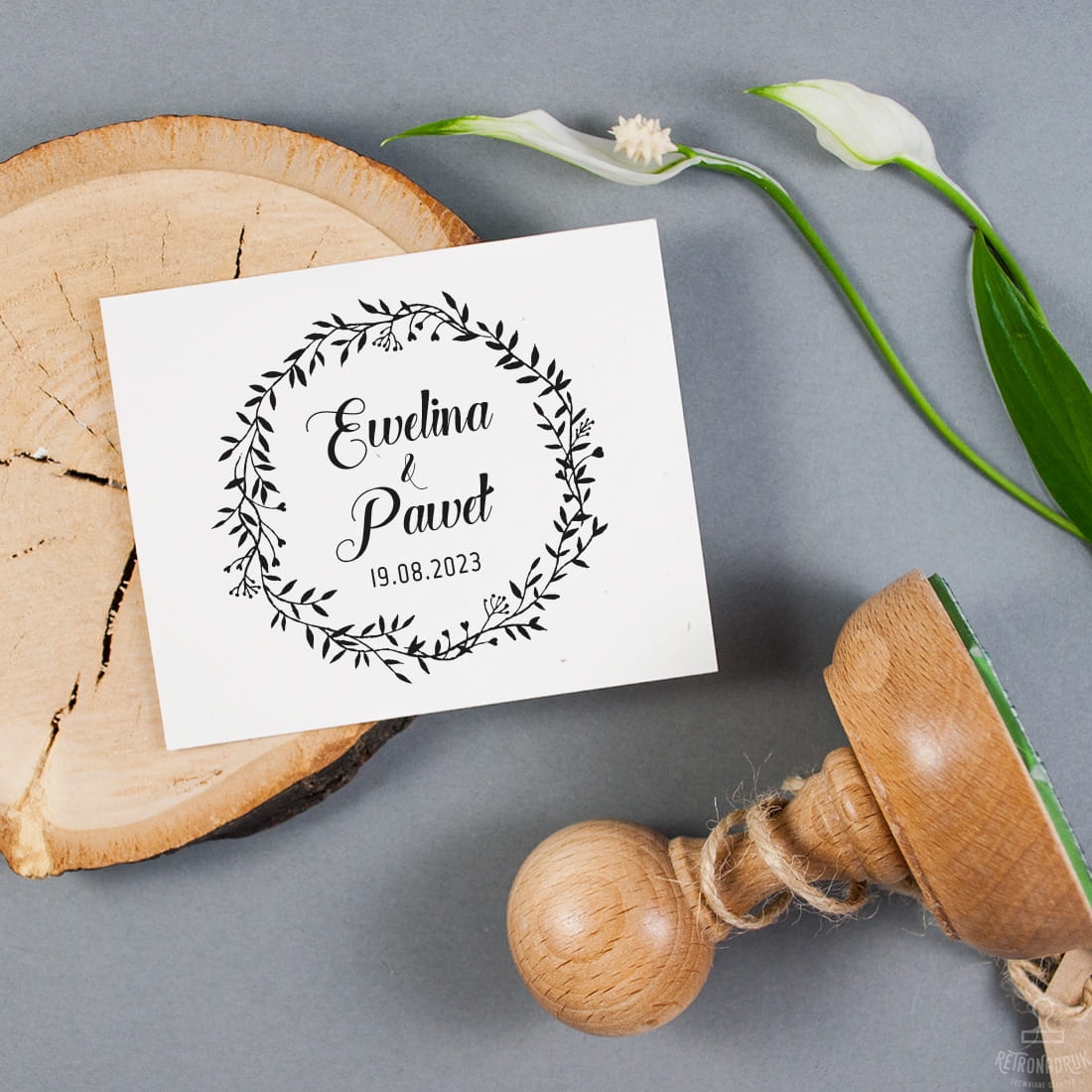Personalizowana okrągła pieczątka ślubna z grafiką wianka. Stempel ślubny spersonalizowany imionami Nowożeńców i datą uroczystości ślubnej. Pieczęć do oznaczania kopert, zaproszeń i innej papeterii ślubno-weselnej. Drewniany stempel retro może być również unikalną pamiątką ślubu dla Pary Młodej.