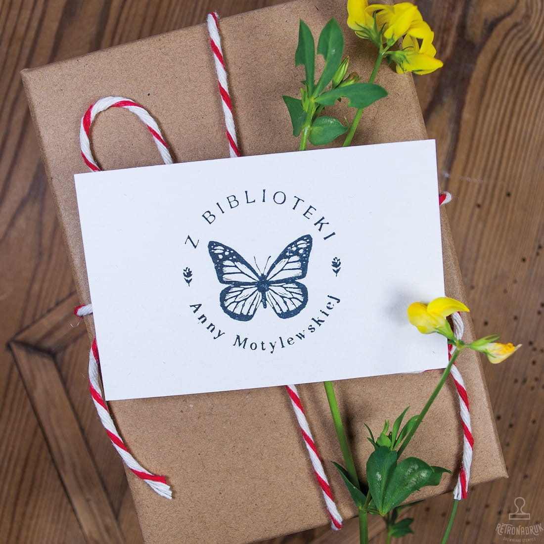 Pieczęć ex libris z motywem motyla do stemplowania ksiażek. Ex Libris w formie drewnianej pieczątki retro personalizowany imieniem i nazwiskiem posiadacza domowej biblioteczki. Exlibrisy to doskonały pomysł na wyjątkowy, personalizowany prezent dla miłośników książek.