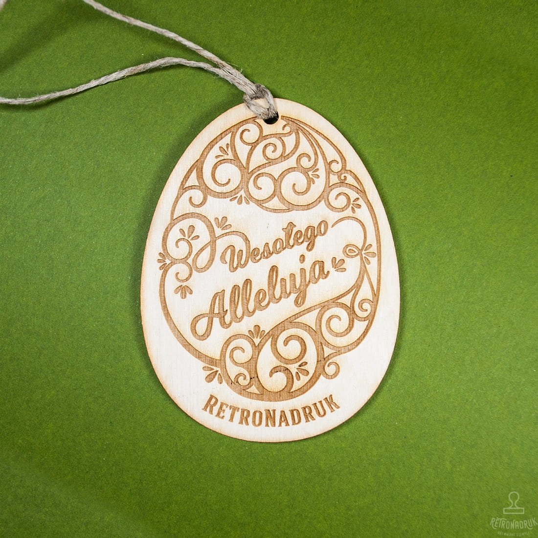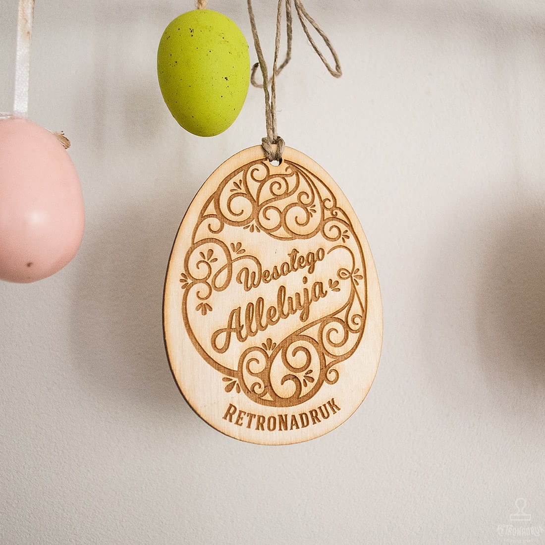 Pisanka wielkanocna wykonana ze sklejki personalizowana tekstem np. nazwą firmy lub marki. Zawieszki firmowe w kształcie jaja z życzeniami świątecznymi.