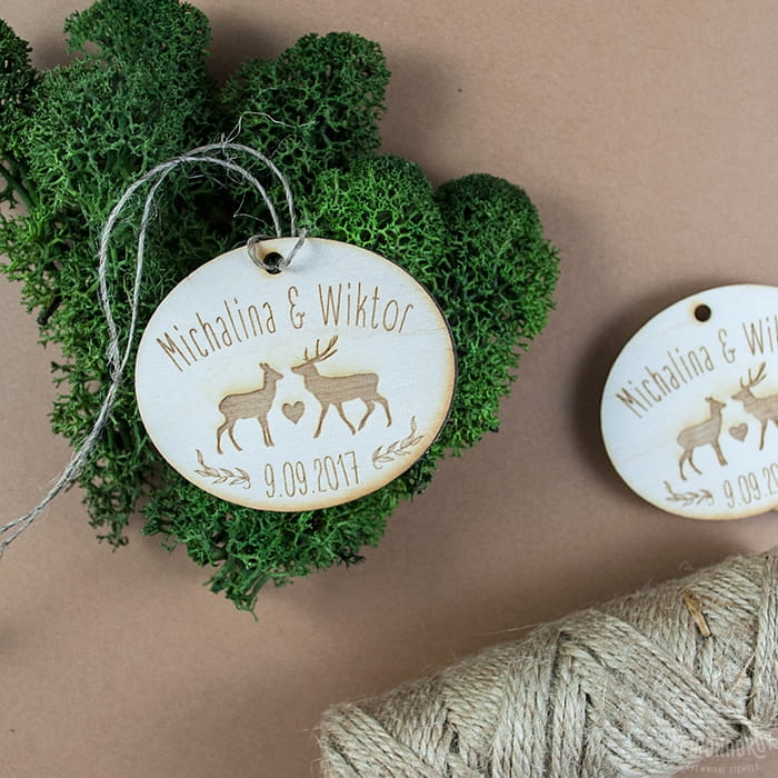 Sklejki zawieszki ślubne z imionami Pary młodej i jelonkami.