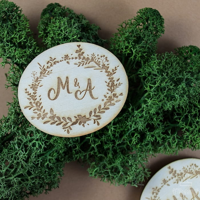 Sklejki ślubne podklejone magnesem z inicjałami Pary Młodej i ozdobnym wiankiem.
