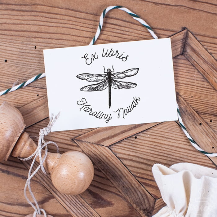 Drewniana pieczątka Ex Libris z motywem ważki, personalizowana imieniem i nazwiskiem właściciela książek. Stylowa pieczątka Ex Libris w formie drewnianego stempla to doskonały sposób na oznaczenie własnej biblioteczki, nadając jej indywidualny i wyjątkowy charakter. Idealna również jako oryginalny prezent dla miłośnika literatury, który ceni sobie personalizowane akcenty w swojej kolekcji książek.