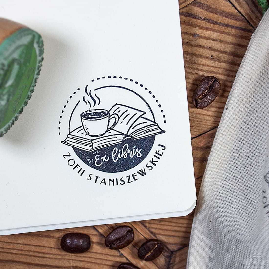 Pieczątka Exlibris z motywem filiżanki kawy i książki, personalizowana Twoim imieniem, to idealny sposób na wyróżnienie swojej kolekcji książek. Dodaj unikalny akcent do swojej biblioteczki lub podaruj bliskiej osobie wyjątkowy prezent